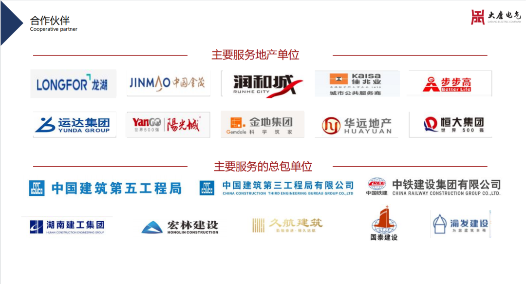 在公司“誠信、務實、精進、共贏”的企業核心價值觀的引導下,我們已與恒大地產、金茂地產、龍湖地產、旭輝地產、佳兆業地產、榮盛地產、保利地產、華遠地產、萬達廣場、步步高商業等開展了長期的深度合作,并承接了國家、省政府等重點項目,如機場、軌道交通、醫院、大中院校等。優質的產品保障、完善的服務體系100%的消防驗收通過率使湖南大唐電氣贏得了全國客戶的贊譽。